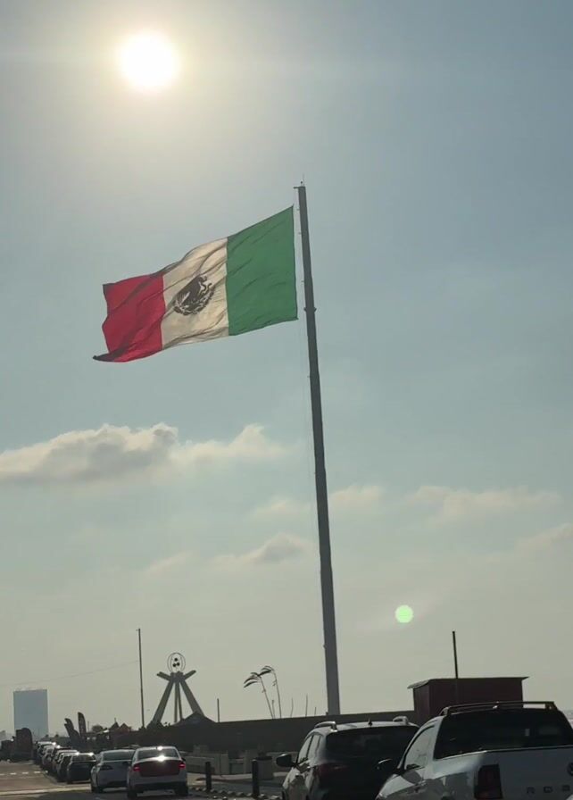 Mexican flag waving in the wind, under a bright sun and a blue sky with scattered clouds. A line of parked cars stretches into the distance. Behind the cars, structures and buildings are visible on the horizon.