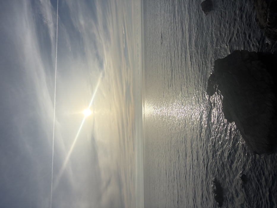 The image captures a coastal scene in Kruče - Kërruçi, Montenegro, during daylight hours. The sun, a bright luminous disc with a prominent lens flare, is positioned in the upper left quadrant of the sky, casting a radiant path of light across the surface of the calm, dark blue-grey water, extending towards the viewer. The sky above is partly cloudy, displaying wispy, cirrus-like cloud formations. A distinct, linear contrail, indicative of an aircraft, horizontally traverses the upper portion of the sky, passing through the sun's glare. In the foreground, along the bottom edge of the frame, several dark, irregular rock formations are partially submerged in the water, exhibiting some surface texture. No individuals or man-made structures other than the contrail are visible.