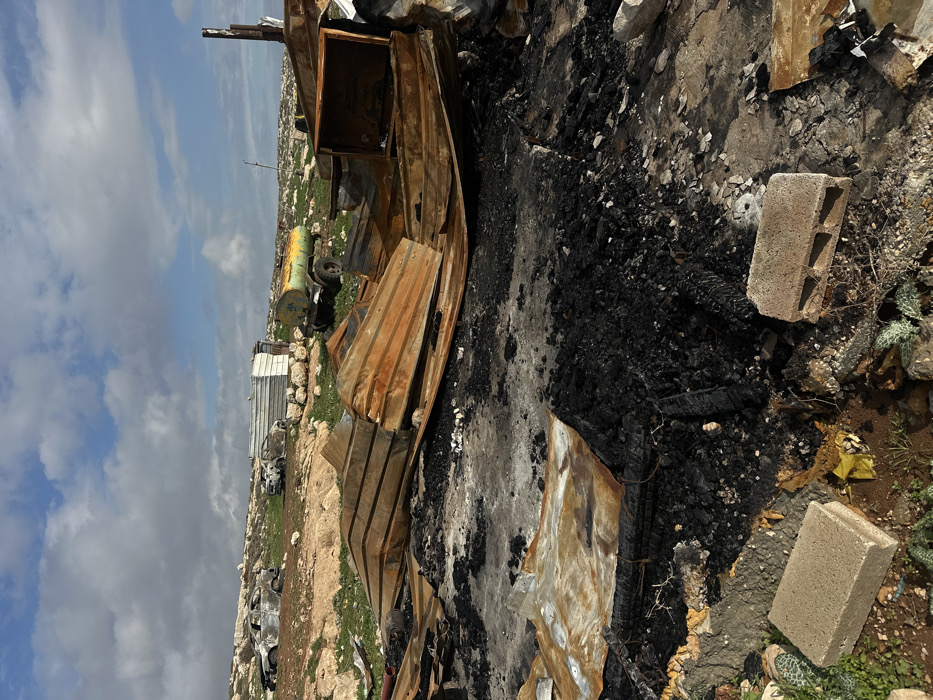 The image depicts a scene of extensive fire damage in Mikhmas Bedouin, Palestinian Territory