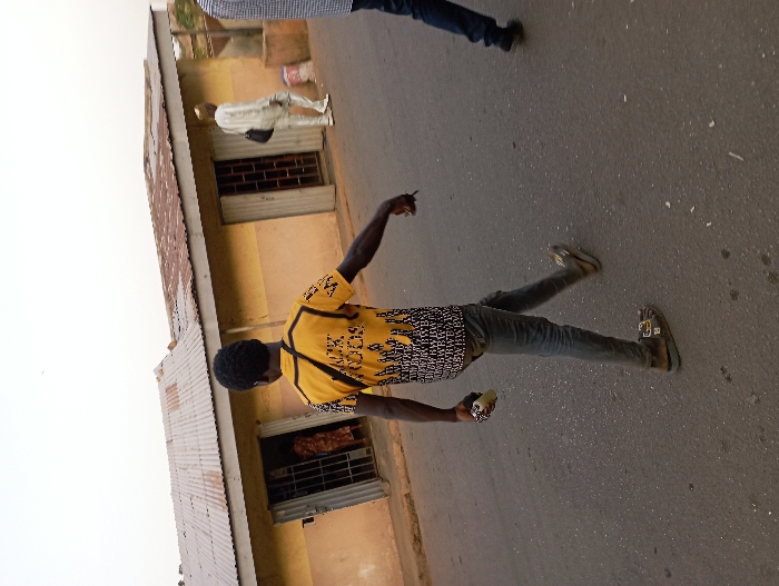 The image displays an outdoor street scene in the city of Jos, Nigeria, under an overcast sky. In the foreground, a dark-skinned male walks from left to right, with his back to the viewer. He is wearing a yellow t-shirt with black patterns and "BLACK WOODS" text, blue denim jeans, and dark open-toed sandals featuring a white 'R' shaped emblem. A black strap from a shoulder bag crosses his chest. He holds a small, light-colored object in his left hand. To his immediate right, partially visible, are the lower legs clad in dark jeans and shoes belonging to another individual also walking right. In the mid-ground, a third person, dressed in light-colored traditional attire and carrying a dark shoulder bag, walks away from the camera towards the right. The background consists of two single-story buildings with light brown walls and weathered, corrugated metal roofs. The left building features an open doorway with security bars, through which a person in a patterned dress is partially visible inside. The right building has a closed metal door with security bars. The ground is an asphalt road speckled with light-colored debris.