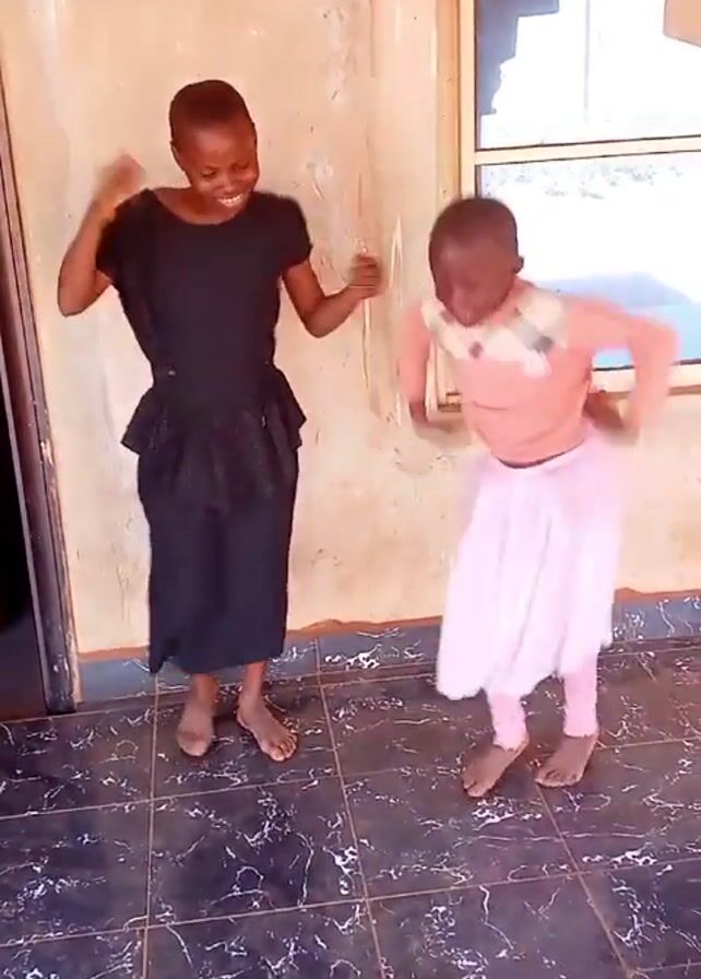 Two young girls are dancing barefoot on a black and white tile floor indoors. One girl wears a black dress and the other wears a pink long-sleeved shirt and a white skirt. They are both smiling and appear to be enjoying themselves. There is a doorway to the left and a window to the right. The walls are beige.