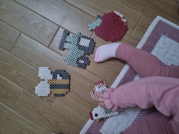 On a wooden floor next to a rug, a child's leg is visible. The child wears a pink sock and pants and is surrounded by pixel art creations. These creations include an apple, a bee, a chicken, and a vehicle. The child is seated on the rug and playing with these beaded figures.