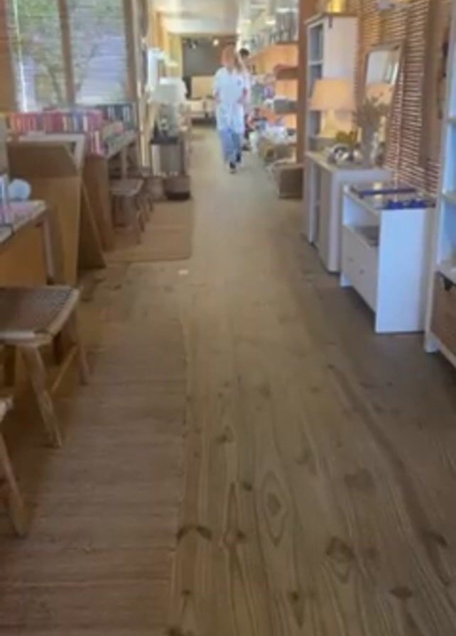 brightly lit interior space that appears to be a shop or showroom. A blonde woman wearing a white lab coat and jeans walks towards the camera down a wooden-floored hallway. The floor is partially covered by a rough, jute-style rug on the left side. On either side of the hallway are displays of merchandise including books, lamps, mirrors, and various decorative items on white shelves and tables. The overall design aesthetic seems to be a blend of natural materials and a clean, minimalist style. Light streams in from windows on the left.