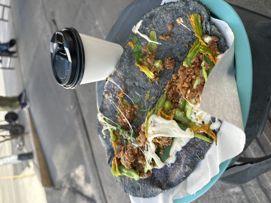 A blue corn tortilla sits on a turquoise plate with a white paper liner. The tortilla is topped with cooked ground meat, squash blossoms, and a white sauce, possibly cheese. A white paper coffee cup with a black lid rests partially on the tortilla and the gray metal table it's placed on. The setting is outdoors, with a blurred street and passersby in the background.