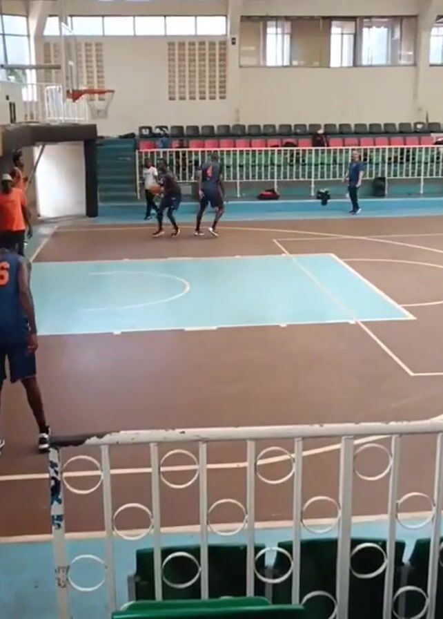 several people playing basketball on an indoor court. The court has a light blue center and a brown perimeter. There is a basketball hoop at one end of the court with a backboard and a metal net. Several people are wearing jerseys, and at least one person is wearing a jersey with the number 36 on it. Some of the players are actively dribbling and passing the basketball. Others are standing or running around the court. In the background, there are bleachers with several people sitting on them. There is a railing in the foreground obscuring part of the view. The lighting in the gym appears bright, with natural light coming through the windows.