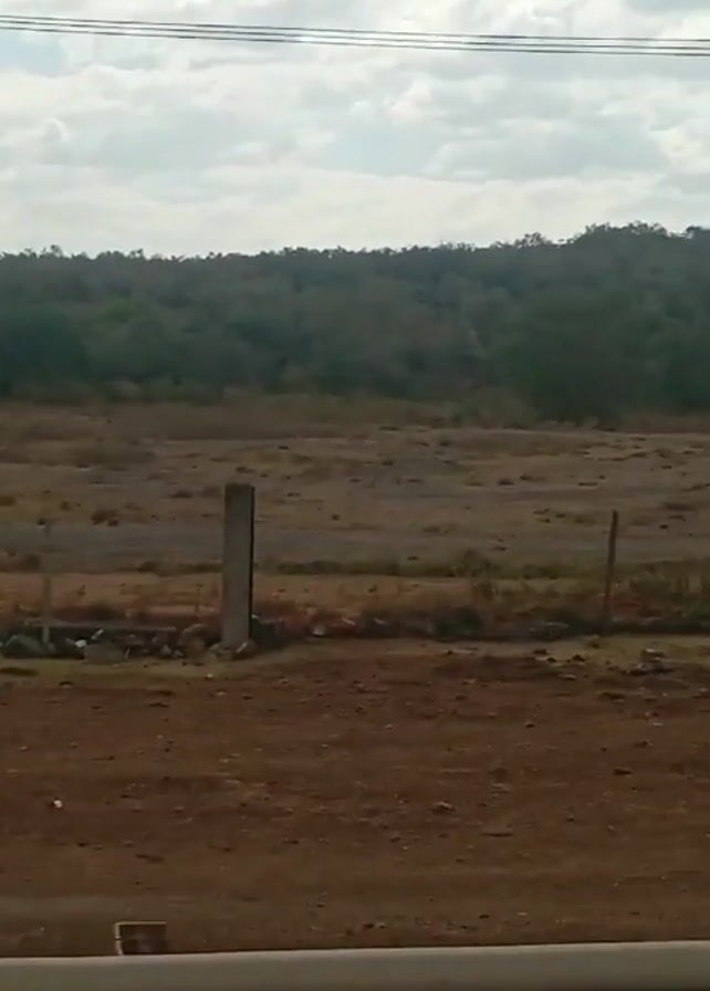 The video depicts a rural landscape, likely captured from a moving vehicle. In the foreground, a metal guardrail is visible, suggesting a roadside view. Beyond the guardrail lies a dry, open field with sparse vegetation and patches of brown earth. The landscape stretches out to a line of green trees, forming a distant tree line against a cloudy sky. Power lines are visible overhead. The general impression is of a dry, somewhat desolate landscape. No people are visible.
