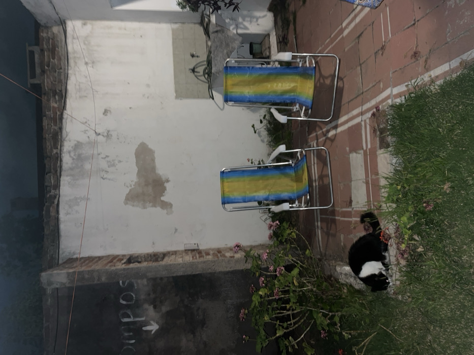 Two empty beach chairs rest on a patio. A black and white cat is partially hidden by tall grass and small flowering plants. Behind the chairs is a weathered white wall with exposed brick at the top and bottom. The wall has visible patching and repairs. A darker structure with white lettering and an arrow adjoins the wall on the bottom left.