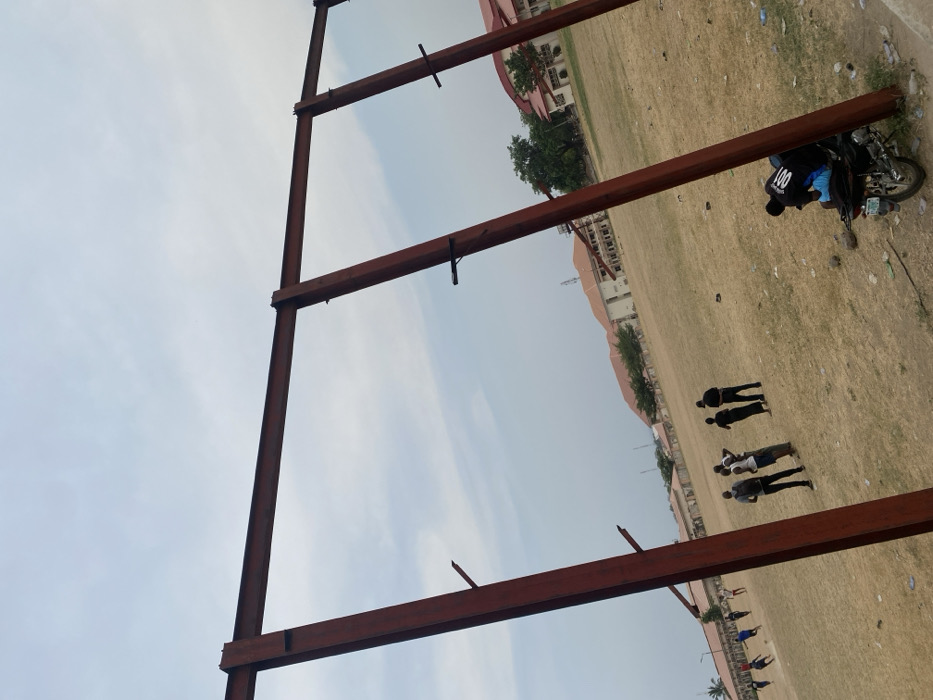 The scene in Lokoja, Nigeria, depicts a dry, open field under a hazy, light blue sky. Dominating the foreground is a partially erected structural framework composed of rusted I-beams, featuring two vertical supports and a horizontal crossbeam, with smaller, broken horizontal protrusions extending from the vertical elements. The ground consists of light brown earth, scattered with debris and litter. Approximately fifteen individuals are present across the field. In the mid-ground, a group of five to six men stands conversing. Further left, several men are actively engaged in a game, with one observed in a kicking motion. In the right foreground, a man wearing a dark shirt with "001" inscribed on the back is positioned next to a black motorcycle parked beside one of the metal beams; a second individual in a light blue top is partially visible behind the motorcycle. The background features several multi-story buildings with reddish-brown roofs, interspersed with trees, suggesting an institutional or campus environment.