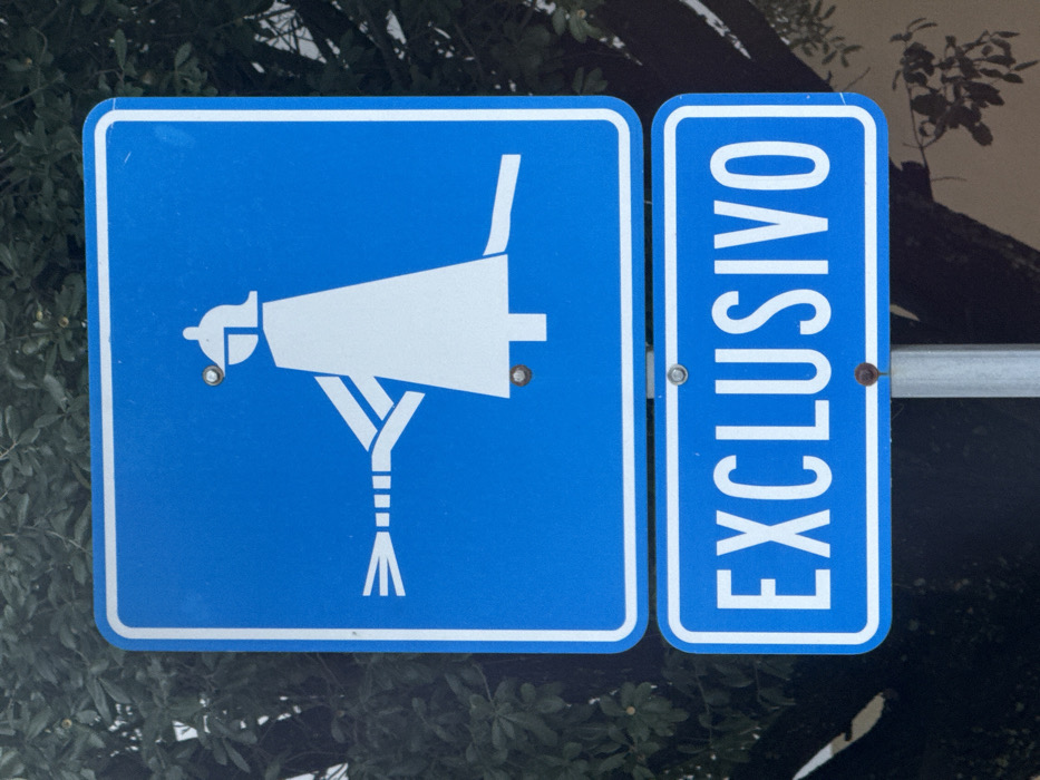 A blue and white rectangular sign displays a stylized image of a person wearing a helmet, likely a firefighter. The figure is holding a hose with water spraying out. Below this, another blue and white rectangular sign reads "EXCLUSIVO" in capital letters. The signs are mounted on a metal pole against a background of trees and foliage. The overall image suggests an exclusive or dedicated area for firefighters.