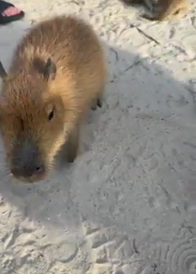 baby capybara standing on a light-colored sandy surface. Part of a person's foot in a black sandal is visible in the upper left corner. A meerkat is visible in the background. The video then shows two capybaras close together on the sand. Someone presents them with a bunch of greenery and orange slices and the capybaras begin eating it.