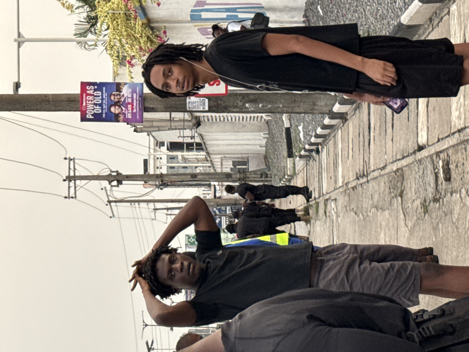 Two men stand on a street. The man on the right wears a black t-shirt, black shorts, and has long dreadlocks. He looks at the camera with headphones on. The man on the left wears a black shirt and grey shorts, standing with his hands on his head. Several figures in black appear to be lying face-down on the street in the background. A utility pole with signage stands next to the man with dreadlocks.