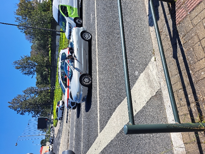 The image displays an urban road scene in the city of Unknown, Unknown, under clear blue skies with direct sunlight. In the foreground, a dark green metal pedestrian barrier with two horizontal rails and one visible vertical post separates a paved sidewalk from an asphalt road. The sidewalk features light-colored brick pavers. The road surface is asphalt, traversed by a prominent, wide, diagonal white painted line. Multiple vehicles are stationary in traffic. The most prominent vehicle is a light silver or grey two-door convertible, possibly a Renault Mégane I, with its soft top retracted, positioned in the middle lane. A single individual, wearing a dark top, is seated in the driver's seat, with their head turned slightly to the right. Directly behind this convertible is a white SUV or crossover vehicle, partially obscured, which exhibits red stripe markings on its side. To the right of these vehicles, a white commercial van with a distinctive light green graphic on its side is present in an adjacent lane or shoulder. Further down the road on the left, an additional white hatchback or crossover vehicle is visible. The background features a raised landscaped area with a low retaining wall, topped by numerous mature green trees. Streetlights with multiple arms and a dark rectangular digital billboard are visible on the left side of the road in the distance.
