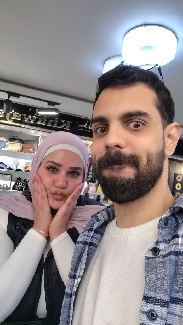 This image captures two individuals, one female and one male, posing for a selfie inside a retail establishment located in Barza Municipality, Syria
