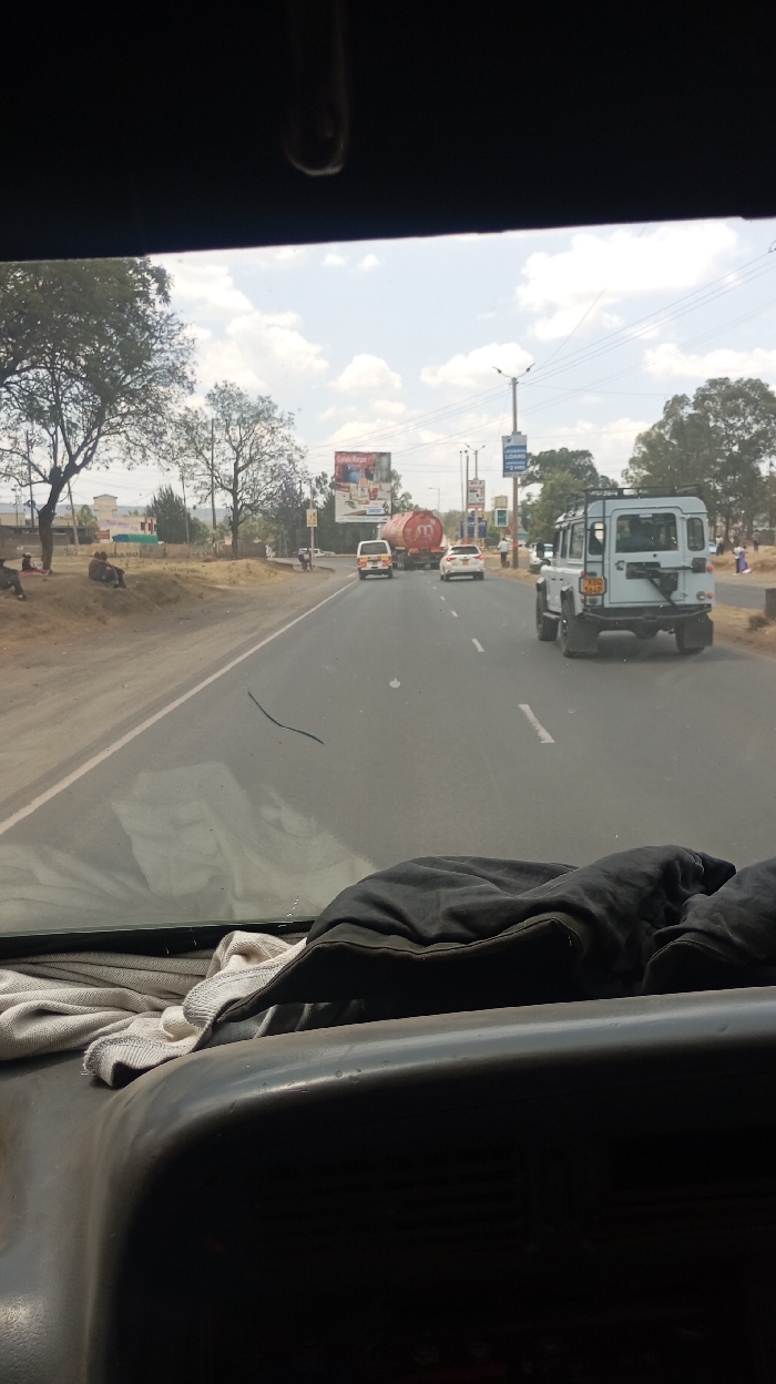 View from inside a vehicle, looking onto a straight asphalt road. A white SUV is in the right lane, with a tanker truck, police vehicle, and white sedan visible further ahead. Trees line the side of the road, and a billboard is present in the background. The sky is partly cloudy. A cloth and dark-colored jacket are on the dashboard of the vehicle.
