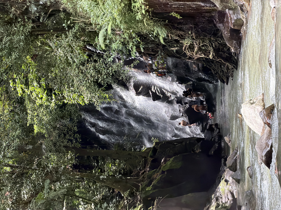 A vertical shot reveals a waterfall cascading down a rock face surrounded by lush greenery. People are seen near the waterfall, some possibly swimming or wading in the water. The scene is a mix of nature's power and human interaction, with the waterfall's force contrasting with the calm presence of the people nearby. The surrounding vegetation, including trees and ferns, adds to the natural beauty of the location.