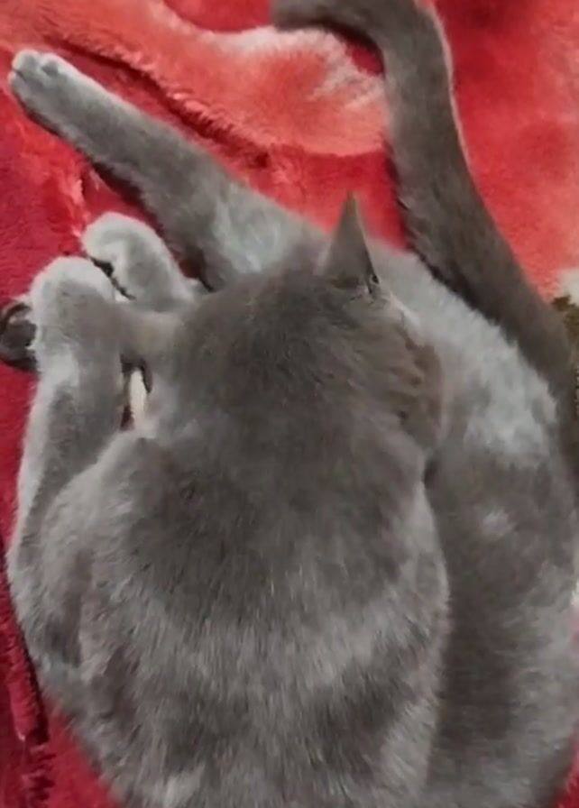 A grey cat curls up on a red blanket with its tail curved and its paws near its head