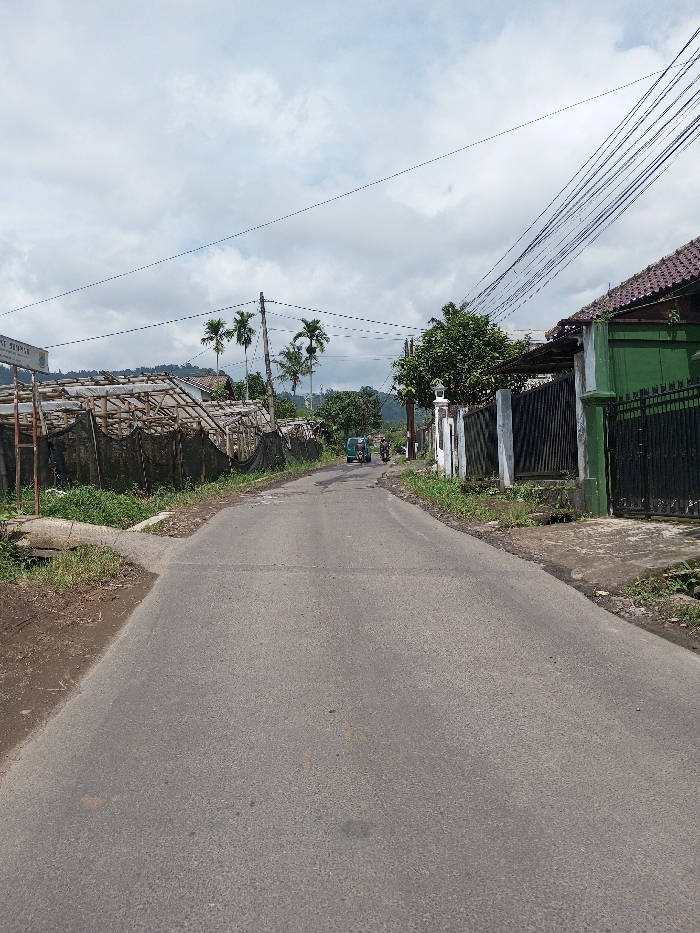 The scene is located in the city of Ariyalai, Sri Lanka. The image depicts a straight, slightly uphill asphalt road, showing wear with patches and cracks, under an overcast sky. On the left side, from foreground to mid-ground, a dirt shoulder transitions into an area with several dilapidated or unfinished structures composed of wooden frames covered with dark netting, resembling agricultural shade houses. A white sign with partially legible dark blue text, including "SUKMA," is affixed to a pole near these structures. Further down the road on the left, several palm trees rise above other foliage, with distant hills visible on the horizon. On the right side, from foreground to mid-ground, a concrete curb and paved area lead to a two-story house with a green exterior and a brown tiled roof. A black metal gate and fence, supported by white pillars, enclose the property. Lush green trees and vegetation are visible behind the fence and house. Multiple utility lines are strung overhead between wooden poles, prominently crossing the sky from the right side. In the mid-ground on the road, a light blue or green compact van or truck is visible on the right side. Behind this vehicle, a person is operating a dark-colored motorcycle, proceeding away from the viewer. The road appears to narrow or curve slightly in the distance. No direct interactions between the vehicles or the single visible person are discernible beyond their presence on the road.
