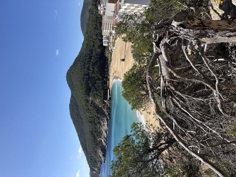 The image displays an elevated view of Cala de Sant Vicent, located in Sant Joan de Labritja, Spain. The scene is dominated by a crescent-shaped sandy beach and a bay with clear turquoise water, under a bright blue sky with minimal cloud cover. In the foreground, a gnarled and weathered dead tree trunk with numerous bare branches is prominent on the right, extending towards the center. Live green pine trees partially frame the view of the bay from both the left and right sides. Small yellow flowers are visible at the extreme bottom right. The midground features a wide, light-brown sand beach. Approximately six discernible individuals are present on the beach, primarily walking along the waterline. A single wooden lifeguard tower or similar structure stands on the beach towards the center-right. The calm sea exhibits a color gradient, transitioning from light turquoise near the shore to a deeper blue further into the bay. The background consists of steep, densely forested hills covered in green trees that encircle the bay. On the right side of the beach, a row of multi-story white buildings, consistent with a coastal resort, lines the shore. Palm trees are situated between these buildings and the sand. A small building with a reddish roof is visible at the base of the hill on the left side of the bay. The overall lighting suggests clear daylight conditions.