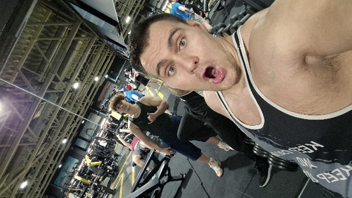 The scene depicts the interior of a gym located in Saint Petersburg, Russia. In the immediate foreground, a male individual wearing a black and white tank top is captured in a selfie-style photograph, displaying an exaggerated expression with wide eyes and an open mouth, his tongue slightly protruding. To the left of the foreground subject, a second male individual with curly light brown hair, dressed in a dark green tank top and dark shorts, stands and looks towards the camera, making a "shaka" hand gesture with his left hand. The background reveals additional gym patrons engaged with various exercise equipment, including one individual lying on a workout bench. The gym environment features a dark floor with yellow demarcation lines, exposed metal trusses and overhead lighting fixtures on the ceiling, and dark walls adorned with large, illuminated panels or screens displaying landscape imagery. Dumbbells are visible on the floor near the foreground subject.
