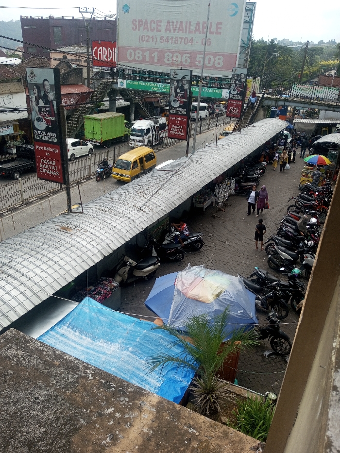 An elevated view shows a busy street and marketplace in Cipanas, Indonesia