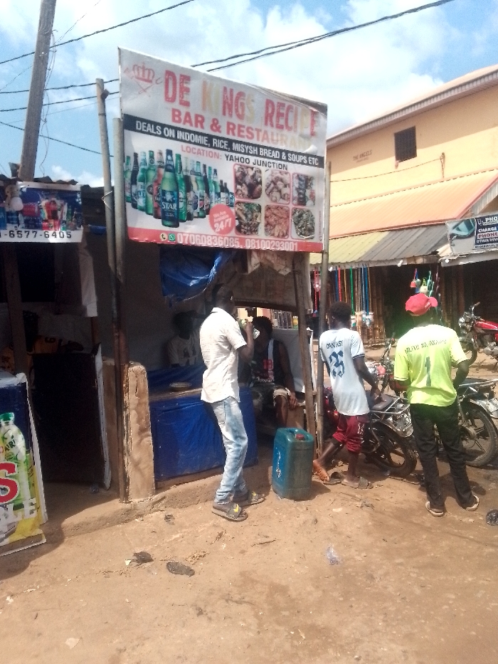 - "An outdoor scene in Awka, Nigeria, at a location identified as Yahoo Junction, features a street-side eatery named "DE KINGS RECIPE BAR & RESTAURANT" by FM-CZj6B3, licensed under CC BY 4.0
