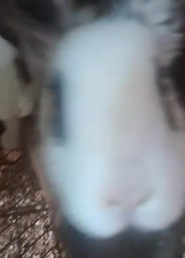 white rabbit with black markings in a cage. The camera is close to the rabbit, focusing on its face. At one point the camera pulls back to show more of the cage and then it moves away, blurring the image.