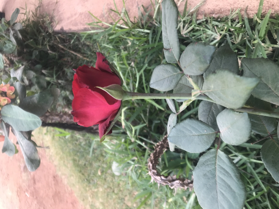 A deep red rose, partially open with a green bud at its base, is prominently featured in the foreground of an outdoor garden scene located in Gura Top, Nigeria. The rose stem is green with visible thorns, and several compound green leaves are present below the bloom. The immediate ground cover consists of green grass, bordered by a reddish-brown dirt path or exposed soil. A low, reddish-brown curb or edge is visible along the right side. In the mid-ground, a dried, thorny plant structure with a distinct curve is present, and behind it, a plant with broad green leaves and clusters of small orange-hued flowers is partially visible. No individuals, actions, or interactions are depicted within the frame.