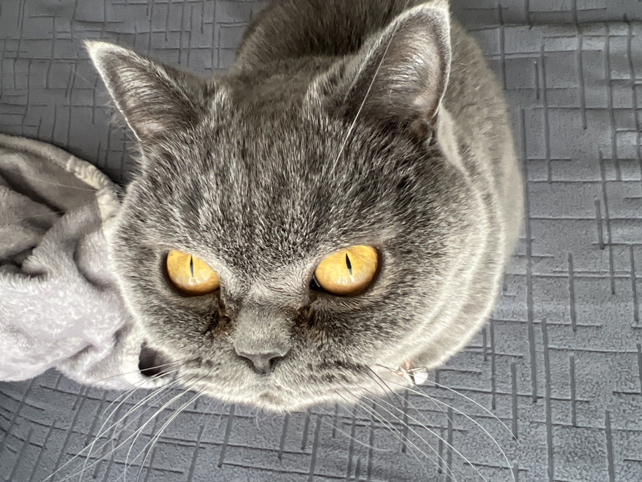 A British Shorthair cat with dense grey fur and prominent, round amber-yellow eyes with horizontally slit pupils is depicted from an elevated perspective