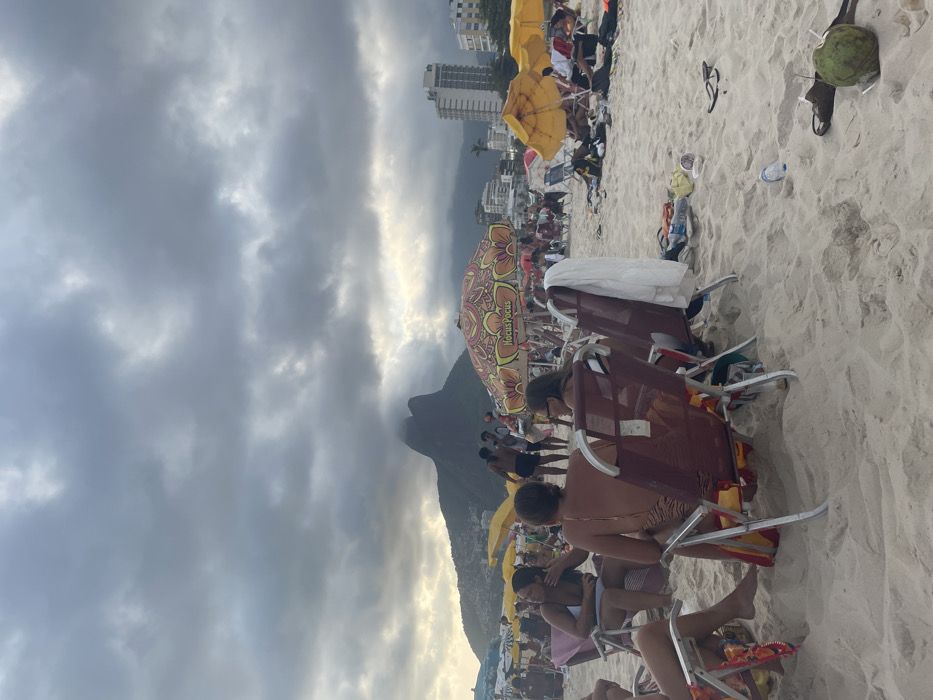 A beach scene under a cloudy sky features numerous people enjoying the sandy shore. Several rows of beach chairs are occupied by individuals relaxing. A prominent mountain peak rises in the background, partly obscured by the overcast sky. Scattered umbrellas and other beach paraphernalia punctuate the scene, and some buildings can be observed.