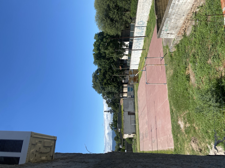 A red court bordered by overgrown grass and a dilapidated brick wall stretches into the distance, where weathered buildings and trees stand against a vibrant blue sky. An air conditioning unit sits in the lower left corner atop a textured surface, obscuring a portion of the view. The perspective is tilted, giving the impression of looking up at the scene.