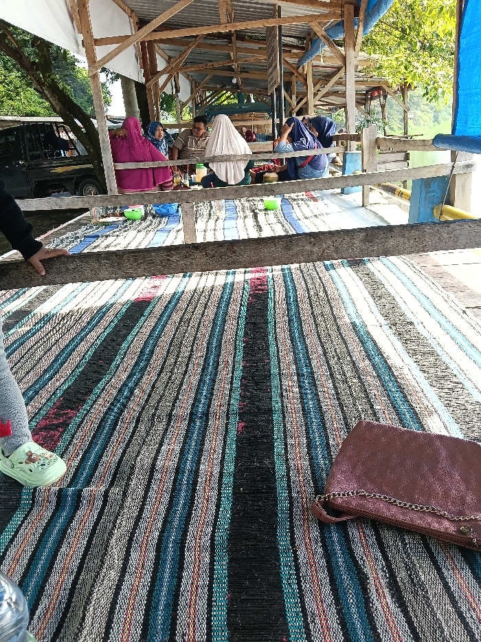 The image depicts an outdoor, semi-enclosed, elevated structure, likely a restaurant or cafe, in Gembong, Indonesia. The structure features a corrugated metal roof partially covered by white and blue tarpaulins, supported by rough wooden beams and posts. The floor is covered with a striped mat, prominent in the foreground, displaying vertical bands of black, blue, teal, white, grey, brown, and hints of red. Approximately 6-8 individuals are seated on mats in the midground. On the left, two women in hijabs are visible; one wears a magenta garment and hijab, facing right, while another wears a blue patterned hijab. In the central area, a man with glasses and a striped shirt faces a woman in a light-colored hijab. Further right, at least two additional women are seated, one in a dark blue hijab. Small green plastic bowls are placed on the mats near these groups. In the immediate foreground, the left hand and forearm of an unseen person rest on a wooden railing. This person's left foot, wearing a light green sandal, is also visible. A dark pink, textured clutch bag with a silver chain strap lies on the striped mat in the lower right foreground. In the background to the left, a black pickup truck is partially visible. Beyond the structure, lush green trees and foliage are present. A body of water is discernible on the far right, beyond a blue tarpaulin barrier and wooden railing, indicating a lakeside or waterfront setting. The scene conveys a casual gathering or meal.