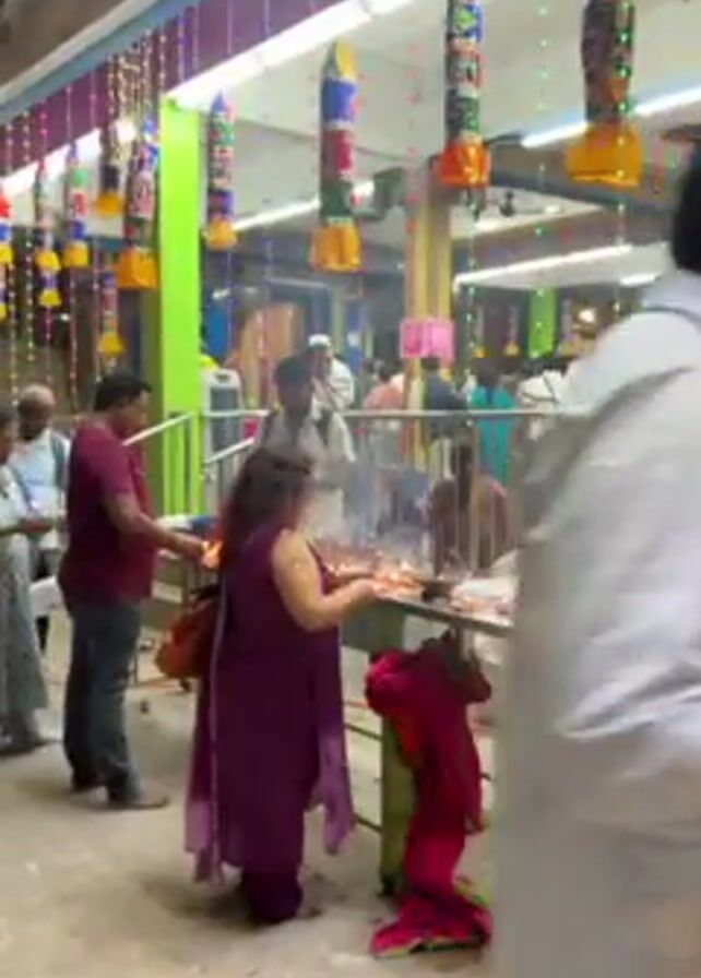 People are gathered indoors, tending to small lit oil lamps arranged on a table. Many are dressed in casual clothing; others are wearing traditional attire. Overhead hangs an array of colorful decorations. The room is well-lit with bright lights. Some smoke rises from the lamps, obscuring the view in places. A metal railing separates the people and the lamps. Some people are interacting with each other, while others focus on the lamps. The general impression is one of a religious ceremony or offering.