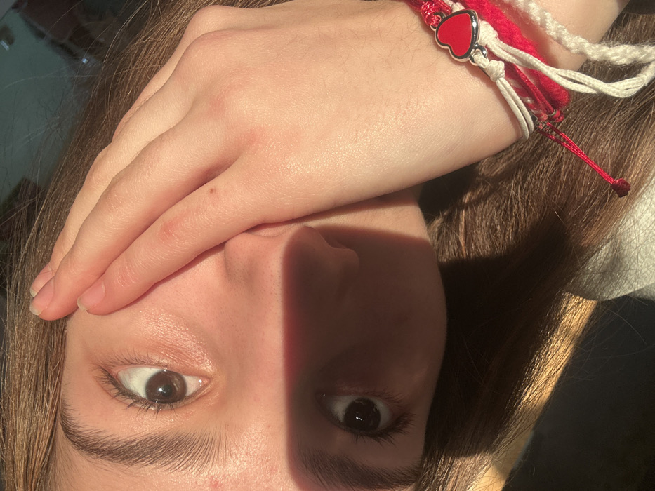 A close-up, high-angle portrait captures a portion of an individual's face and hand under direct, bright sunlight. The subject has fair skin, dark brown eyes, and dark brown hair, which appears long. The right eye (viewer's left) is fully open, its dark brown iris and pupil centered, while the left eye (viewer's right) is partially visible at the bottom of the frame, also open and directed forward. The eyebrows are full and dark. A right hand (viewer's left) with natural fingernails is positioned over the upper right side of the face, obscuring part of the forehead and the bridge of the nose, casting a strong shadow across the lower left facial features. Multiple woven bracelets are visible on the wrist of the hand, featuring red and off-white/cream colored threads. One prominent bracelet displays a red heart charm set in silver-colored metal. Strong highlights are present on the exposed skin and hair, indicating direct light exposure. The background is out of focus and indistinguishable. The specific location within Ruse, Bulgaria, is not discernible from the provided image details.