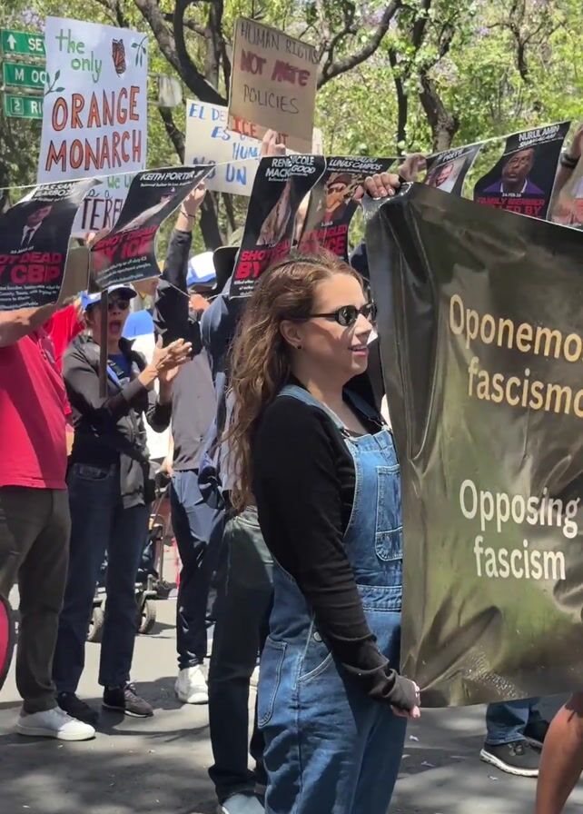 protest march during the day. There are many protesters visible, holding signs. A large banner is being held stating "Oponemos el fascismo" and "Opposing Fascism." Other signs have photographs of individuals and text reading "SHOT DEAD BY ICE" or "SHOT DEAD BY DHS." Some other signs read "ORANGE MONARCH" and "HUMAN RIGHTS NOT HATE POLICIES." The protesters are on a city street lined with trees. A protester with a megaphone is visible. Some of the protesters are clapping and cheering. The weather is sunny.