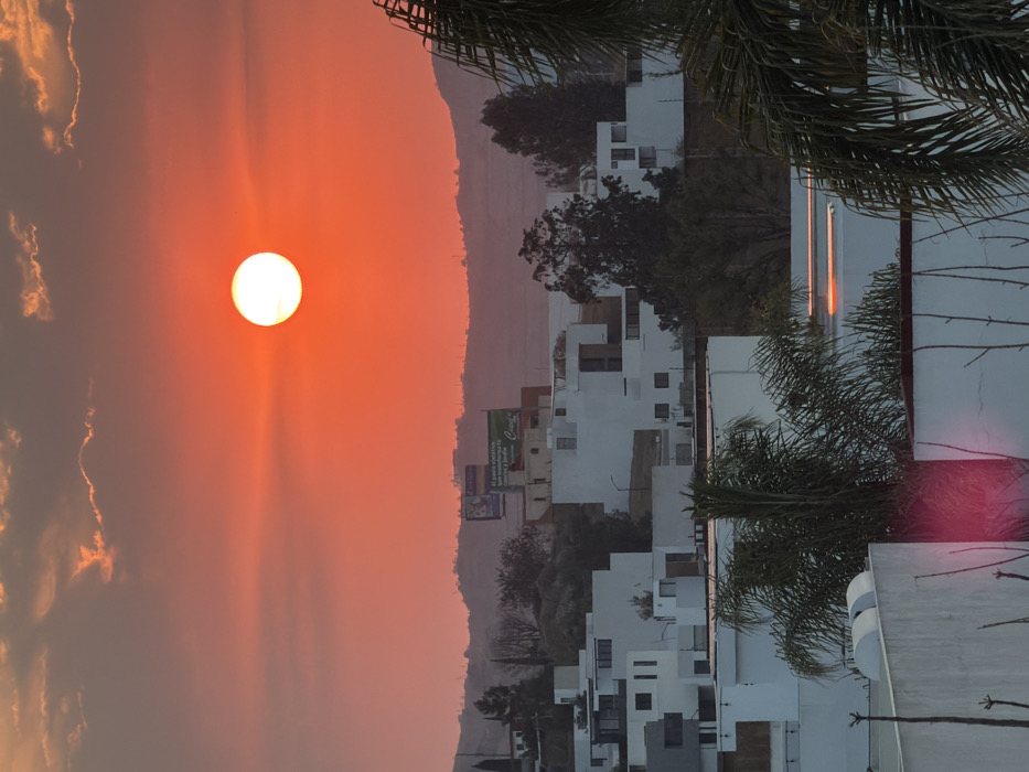A vibrant orange sun dominates a hazy sky, casting a soft glow over a hillside town with boxy, white buildings. Lush, green trees dot the landscape, partially obscuring the structures. Palm fronds frame the upper right, adding a tropical touch. A hill rises in the background, silhouetted against the bright sky. The image is rotated so the sun is on the left.