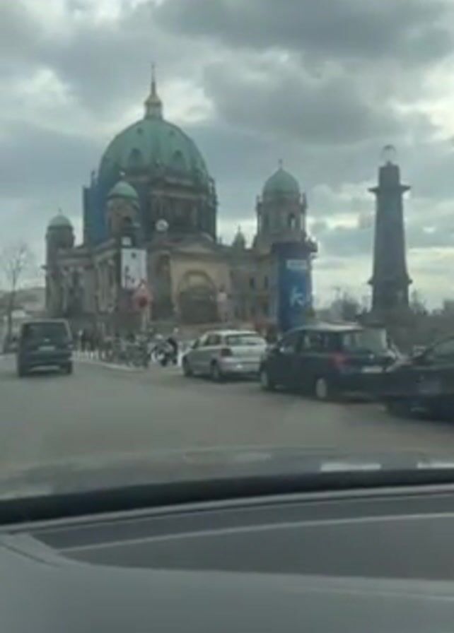 view from inside a car, looking out at a city scene. The primary focus is the Berlin Cathedral, a large, ornate building with a distinctive green dome and smaller towers. In front of the cathedral, there's a row of parked bicycles and a street with cars moving slowly. The sky is overcast with a heavy cloud cover. A monument or tall column is visible to the right of the cathedral. There are people walking on the sidewalks.