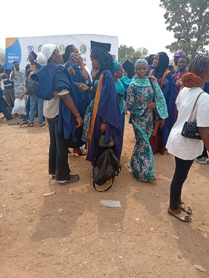 The image depicts an outdoor university event, specifically a matriculation ceremony, situated in Adankolo, Nigeria, evidenced by a prominent banner displaying "Happy Matriculation" and institutional logos, including that of Federal University Lokoja. Approximately fifteen to twenty young adults are visible, predominantly dressed in dark blue academic gowns and caps, some worn over traditional Nigerian attire. Individuals are observed standing, walking, and engaging in conversation; one woman in the middle-left holds a mobile phone to her ear. In the immediate foreground, a woman in a white head wrap and dark blue gown stands with her back to the camera. Adjacent, a woman in a dark blue gown with orange lining holds a black backpack. Further right, a woman in a teal head wrap and patterned dress, wearing an academic cap, faces the camera directly. The right foreground shows a woman from behind, with reddish-brown hair, wearing a white t-shirt and carrying a black quilted handbag. The ground is an uneven, reddish-brown dirt surface containing scattered small stones and minimal debris, including a plastic bag and a piece of wood. Beyond the attendees, a large white banner functions as a backdrop. Distant trees and a hazy mountain range are visible under natural daylight conditions.