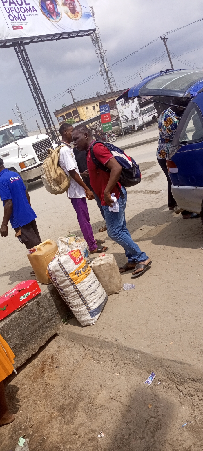 The scene depicts a busy roadside area in Ohoro, Nigeria, under an overcast sky