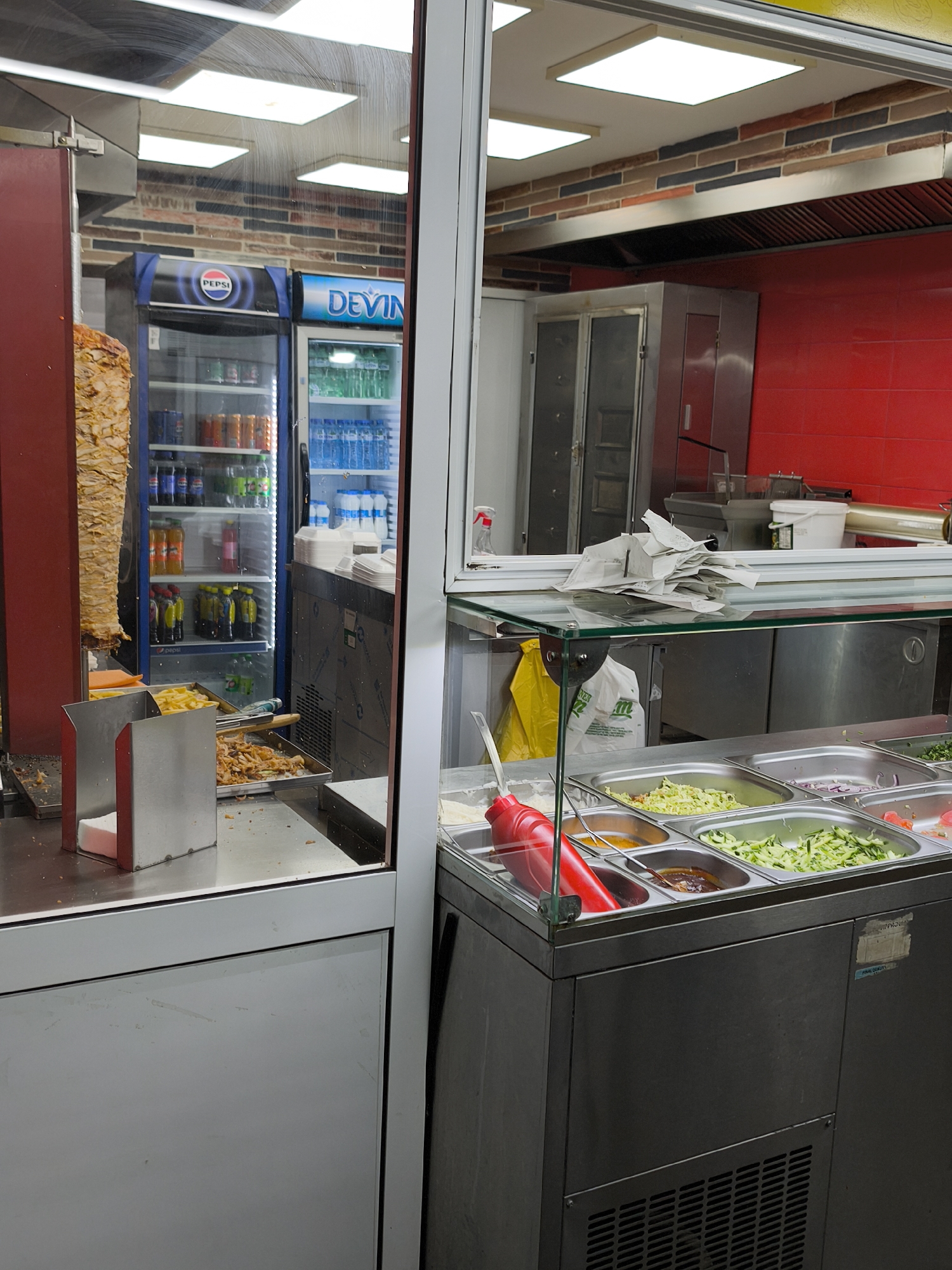 The image depicts an interior view of a fast-food establishment, likely a kebab shop, located in Burgas, Bulgaria. The scene is divided by a white-framed glass partition, separating a food preparation area on the left from a serving or salad bar area on the right. On the left, behind the glass, a vertical rotisserie holds a large cone of cooking meat, presumed to be doner kebab or gyros. Below it, on a stainless steel counter, metal trays contain cooked, shredded meat and french fries. In the background, two commercial glass-front refrigerators are visible: one branded "PEPSI" containing various soft drinks, and another branded "DEVIN" (a Bulgarian water brand) stocked with bottled water. Above these, a section of wall features a brick pattern, and the ceiling contains multiple square recessed light fixtures. On the right, in the foreground, a refrigerated display counter houses several stainless steel gastronorm containers. These containers hold prepared salad ingredients, including shredded cabbage, diced cucumbers, and sliced red onions, along with various sauces or dressings. A red squeeze bottle is positioned among these containers. Above this counter, on a glass shelf, a stack of white paper or receipts is visible. A gloved hand, presumably belonging to a staff member, is partially visible reaching towards the salad items. The background of this section features a red tiled wall with a stainless steel commercial extractor hood mounted above. Additional stainless steel kitchen equipment is partially visible in the background and reflections.