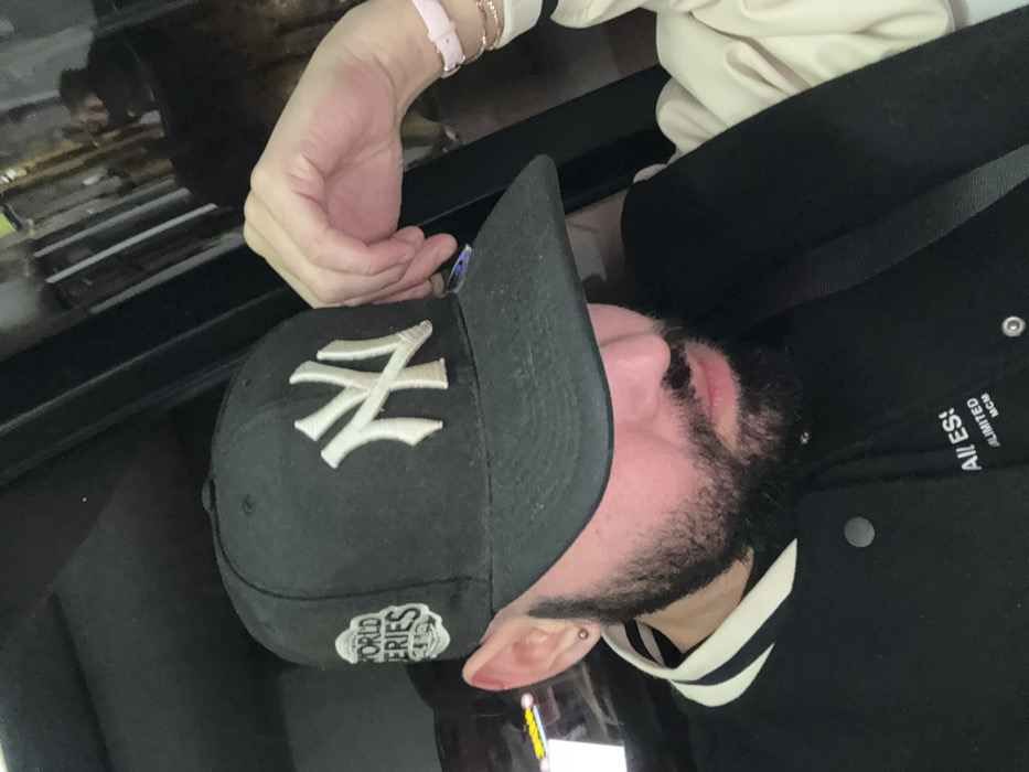 A person with a dark beard and a baseball cap is seated. The cap is black with a white emblem and the words "WORLD SERIES". They are wearing a jacket with white stripes on the collar. The person's hand is visible, adorned with a pink watch and bracelets. The background appears to be a car interior.
