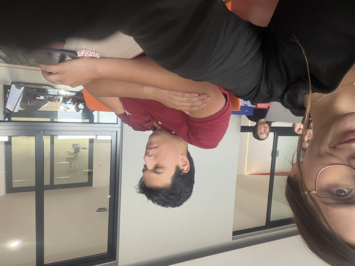 A selfie captures three individuals in an office setting. The selfie taker is on the right, wearing glasses and a black top. To the left, a man in a maroon shirt has his arms crossed. In the background, another person sits at a desk. A laptop is visible in the foreground. The office features orange accents, a monitor displaying flags, and windows looking onto an external area.