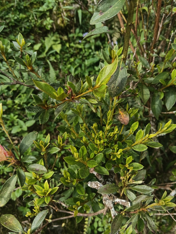 The image presents a close-up, top-down perspective of a leafy green plant, identified as a shrub or bush, situated in Tamghas, Nepal. The plant is characterized by numerous oval to elliptical leaves, varying in color from light, bright green new growth to darker green mature leaves. Some leaves exhibit a dusty or lightly discolored texture on their surfaces. A prominent cluster of small, tightly packed, light green buds or very young leaves is visible towards the center-right of the frame, indicating active plant growth. Thin, woody stems and branches, predominantly brown or reddish-brown, are interspersed among the foliage; some segments bear lighter, possibly lichen-covered markings. The background consists of out-of-focus green foliage, establishing a natural, vegetated environment. No people, objects other than vegetation, or direct actions or interactions are depicted.