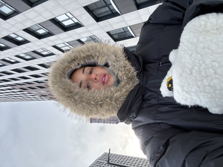 An outdoor, low-angle, close-up selfie depicts a young adult female in a cold environment