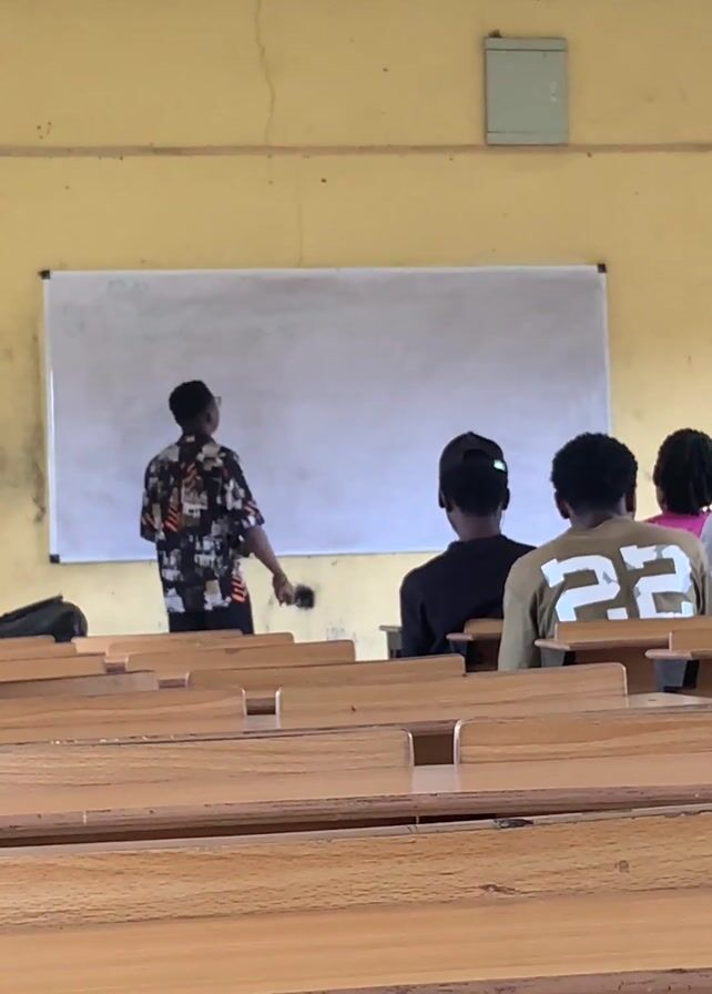 small lecture hall, sparsely populated with students seated at wooden desks arranged in rows. A young man stands at the front of the room facing the students. He is writing on a whiteboard mounted on the yellow wall. The students are facing him, mostly from the back view. The room is brightly lit and the desks appear well-used with visible wear. The students are wearing a variety of clothes, and their posture suggests that they are paying attention to the lecturer. The atmosphere is typical of a classroom setting, conducive to learning. A utility box is mounted above the whiteboard.