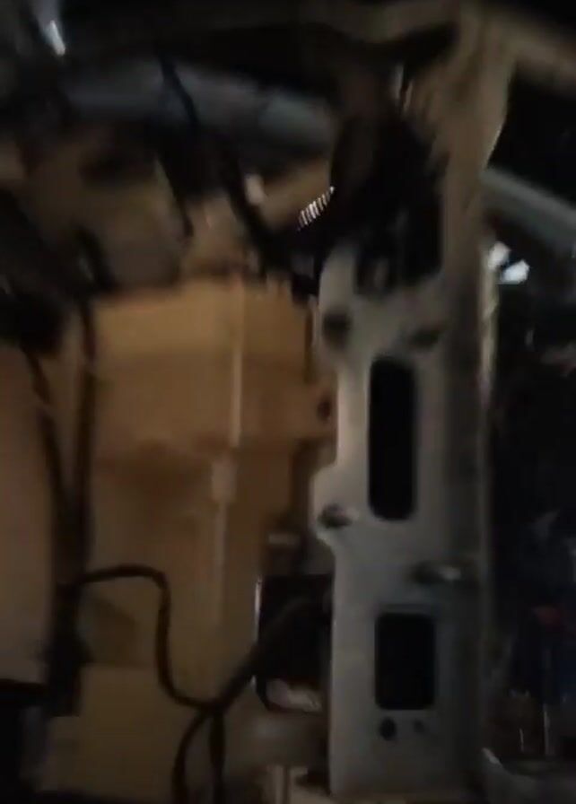 The camera pans up to reveal a white car frame on a raised metal structure inside a warehouse-like building. The car's hood is open, exposing the engine area. The environment appears dimly lit.