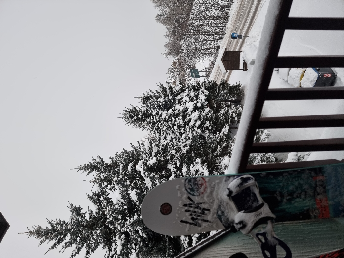 - "A snowboard rests on a snowy balcony with wooden railings" by FM-Uq0Y63, licensed under CC BY 4.0