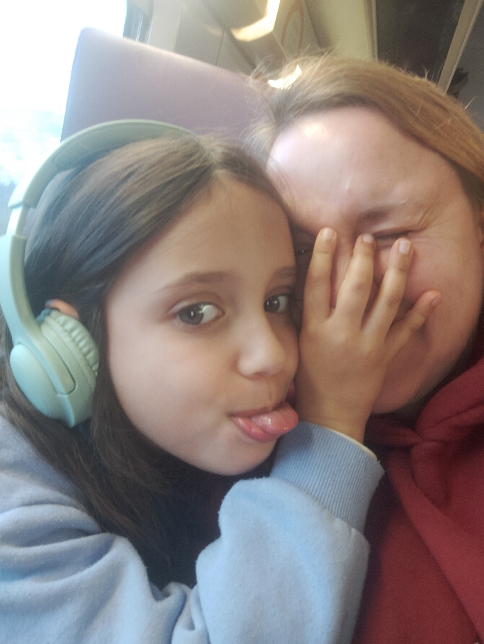 The image displays two individuals, an adult female and a female child, situated within a transportation vehicle, likely a train, in Avignon, France. The adult, positioned on the right side of the frame, has reddish-blonde hair and wears a red hooded garment. Her face is partially obscured by the child's left hand, which covers her left eye and the bridge of her nose. Her visible right eye is squinted, consistent with a smile or laugh. The child, on the left, has dark hair and is wearing light blue over-ear headphones. She is dressed in a light blue sweatshirt. Her tongue is extended outwards, and her left hand is pressed against the adult's face. The background reveals portions of a purple upholstered seat and a window admitting bright external light, along with overhead interior light fixtures typical of a train carriage.