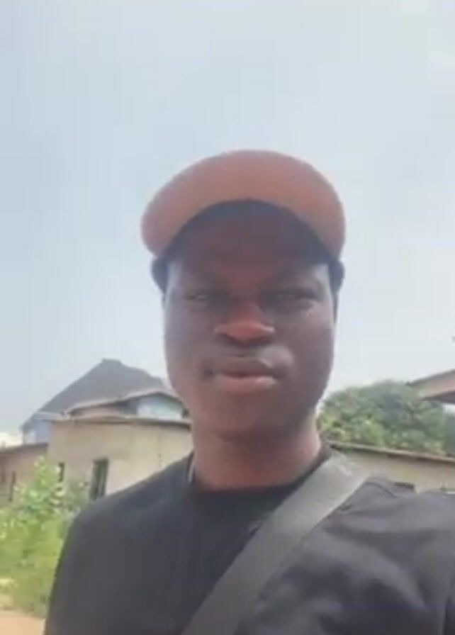 A young man with dark skin wears a black T-shirt, a tan baseball cap, and a gray strap across his chest. He looks directly at the camera, then makes a peace sign with his right hand. Behind him are houses of modest construction and a clear sky. The location appears to be a small, rural town.