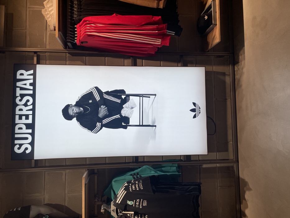 The image depicts the interior of an Adidas retail store, likely located in Forum Aveiro, Aveiro, Portugal. A prominent vertical lightbox display, approximately 2.5 meters in height, occupies the central portion of the frame. This display features a black and white image of an adult male seated on a dark, minimalist folding chair. The man wears a dark tracksuit with three white stripes, a dark beret, circular spectacles, and light-colored Adidas Superstar sneakers. The poster's upper section displays the word "SUPERSTAR" in black capital letters, and its lower section features the black Adidas trefoil logo. To the left of the display, a wooden shelving unit holds a selection of black and green athletic apparel. Visible items include a black short-sleeved shirt with "PETRONAS INEOS" and other sponsor branding, alongside green long-sleeved garments with three white stripes. To the right of the display, another wooden shelving unit presents rows of red Adidas track tops, each featuring three white stripes on the sleeves. An upper shelf displays light-colored Adidas sneakers, while a lower shelf holds a black Adidas cap with the trefoil logo, resting in a metallic tray. The store's floor is composed of light grey concrete, and the background walls exhibit a light brown, brick-patterned texture. No individuals are present within the observable scene, which portrays a static retail merchandising arrangement.