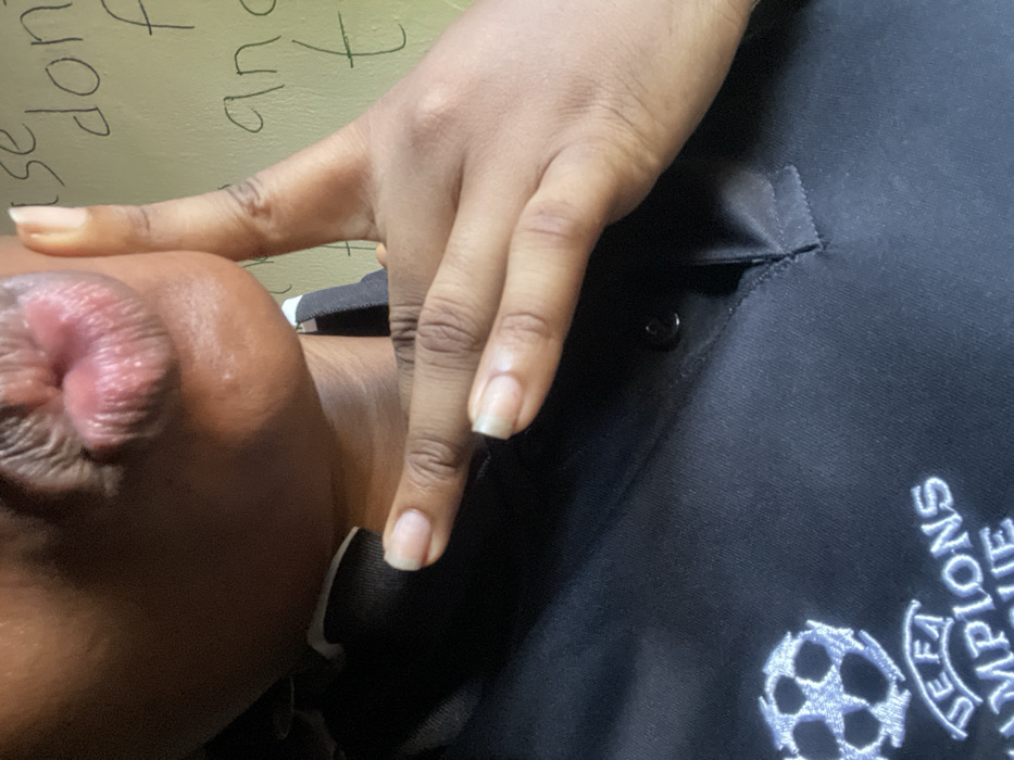 The image displays a close-up of an individual's lower face and right hand. The individual has dark brown skin, with lips puckered forward in a 'kissing' gesture, exhibiting a reddish-pink hue. The right hand, featuring natural-length, unpainted fingernails, is positioned with fingers lightly splayed against the jawline and neck area. The individual is wearing a black polo shirt with a visible collar and a two-button placket. An embroidered logo, depicting a football surrounded by stars and the text "UEFA Champions League", is visible in light embroidery on the left chest of the shirt. The background is a solid light green wall bearing faint, dark handwritten text, including fragments such as "use", "don", "f", "and", "t". The scene is located in Ajaokuta, Nigeria.
